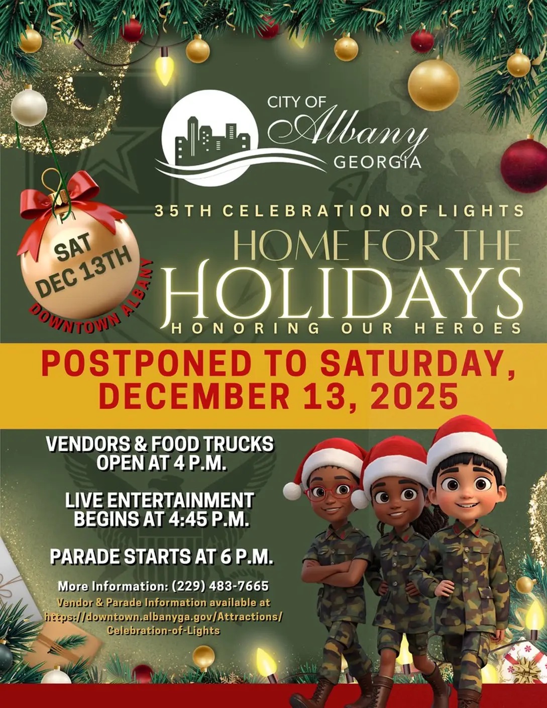Albany, GA – The 35th Celebration of Lights Christmas Parade, originally planned for Saturday, December 6, has been postponed due to weather.